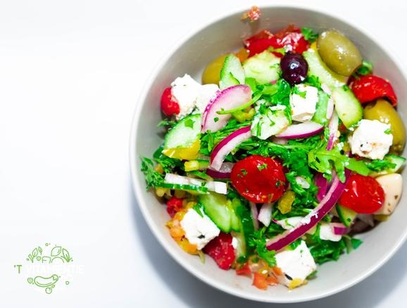 Rucola, paprika, komkommer, rode ui, olijf, balsamico azijn, Feta-kaas