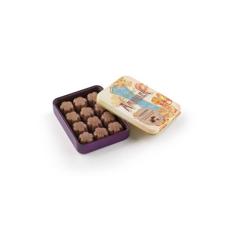 Blikje melkchocolade bloemetjes met cappuccino vulling (72g)
