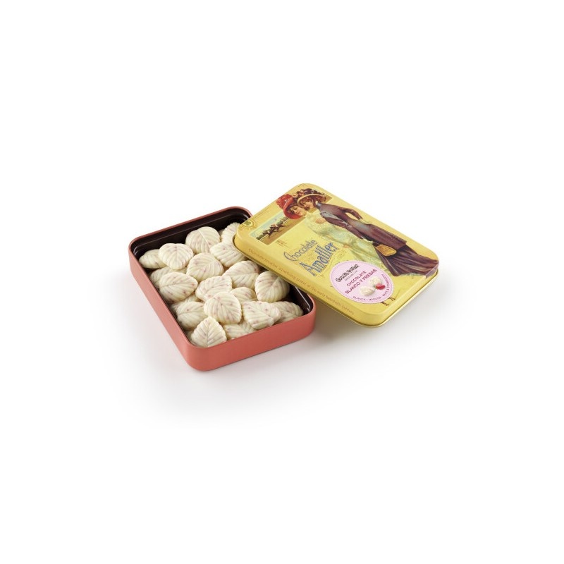 Blikje witte chocolade bloemblaadjes met aardbeien (72gr)