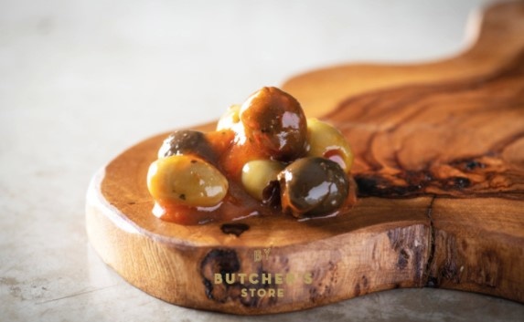 Gemengde groene en zwarte olijven in een pittig sausje op basis van chili.