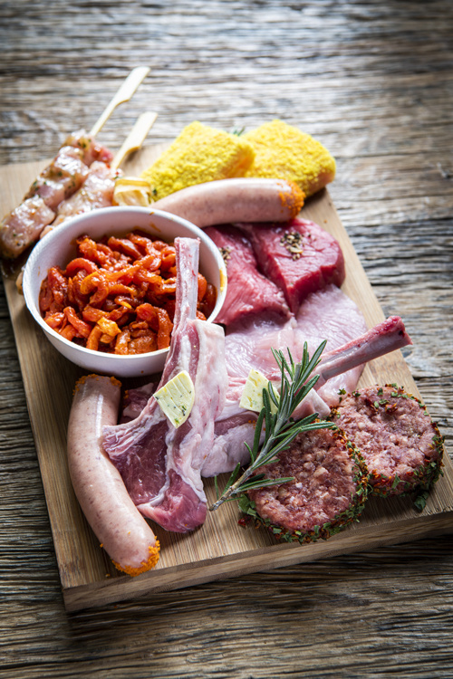 Tournedos, gemarineerd reepjesvlees, mini cordon bleu, mini hamburger, lamskoteletje, kalkoenlapje, spiesje van presa Duroc, kalfsworstje.
