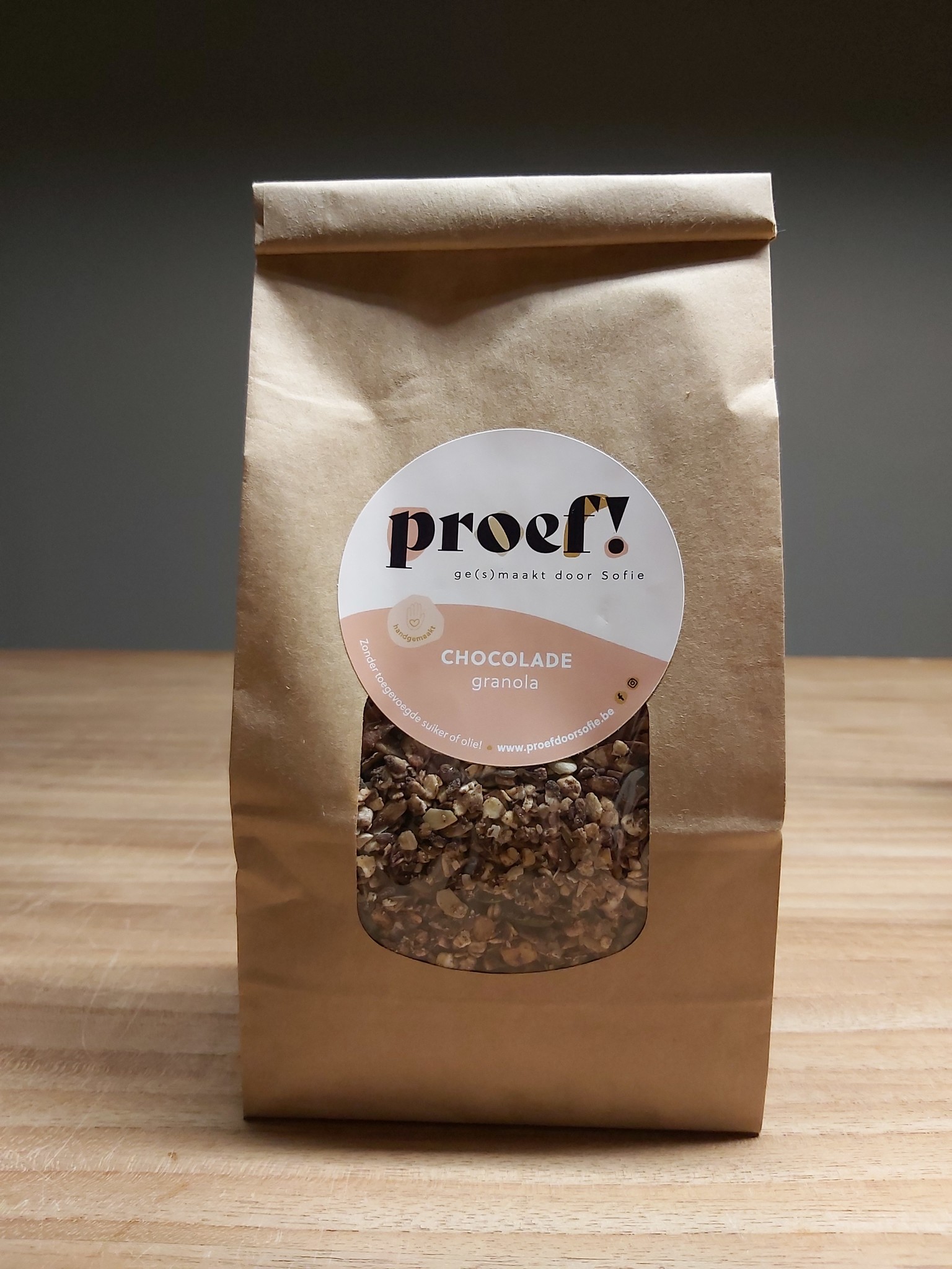 Ingrediënten: havervlokken, noten (amandelen, walnoot, hazelnoot, pecannoot, paranoot, cashewnoot), chocolade (70% cacao) zonnebloempitten, pompoenpitten, lijnzaad, kokosvlokken, amandelschilfers.