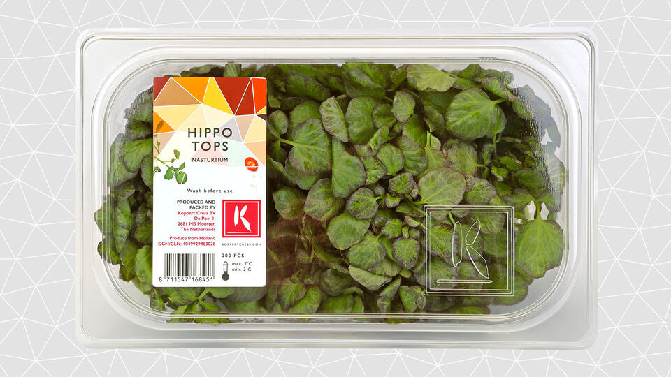 Hippo Tops is een waterkers selectie, met een paarse tekening aan het uiteinde van de bladeren.