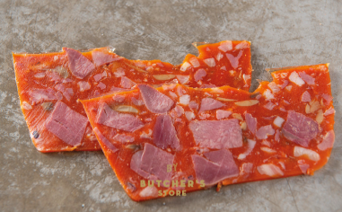 Mager kopvlees met stukjes varkenstong en madeirawijn.