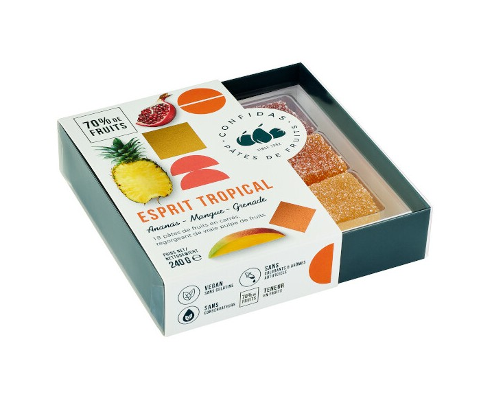 Confidas pâtes de fruits, een hoogwaardige fruitsnoep gemaakt van minstens 50% fruitpuree. Esprit tropical omvat de volgende smaken: ananas, mango en granaatappel.