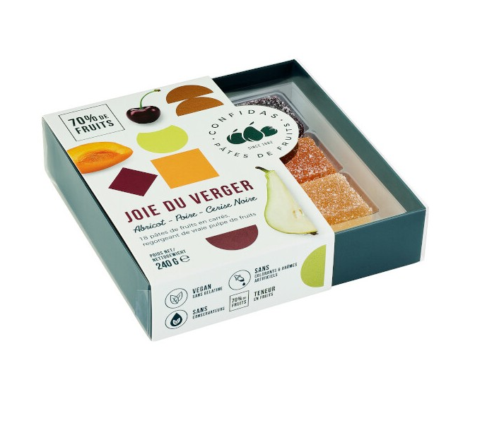 Confidas pâtes de fruits, een hoogwaardige fruitsnoep gemaakt van minstens 50% fruitpuree. Esprit tropical omvat de volgende smaken: ananas, mango en granaatappel.