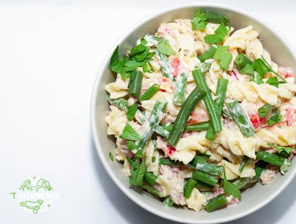 pasta, tomaat, ui, boontjes, tonijn, dressing