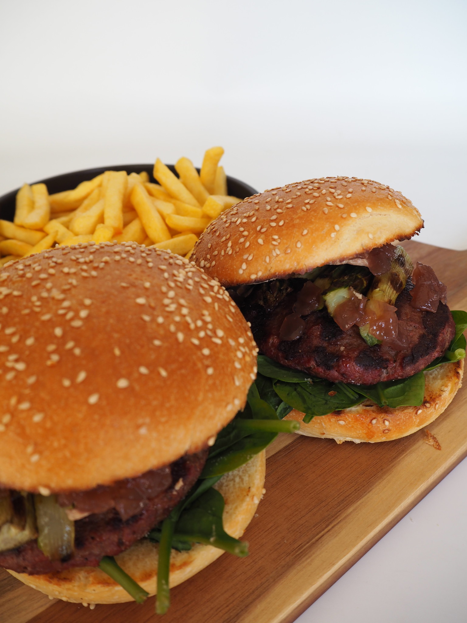 Maak een rundsburger met gebakken ganzenlever, rode uienconfituur, jonge bladspinazie. Versgebakken frietjes on the side.