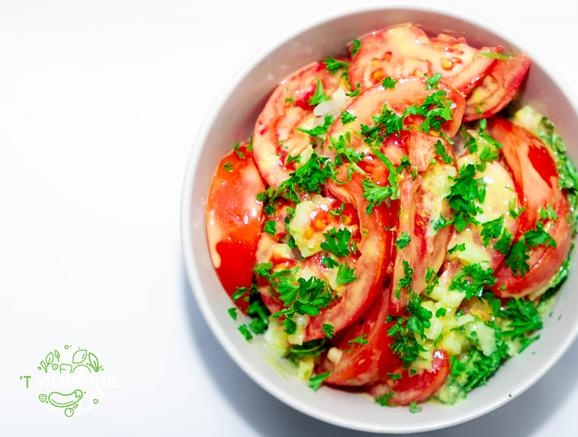 Tomaat, ui, peterselie, dressing