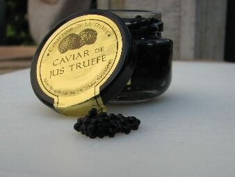 kaviaar gemaakt van sap van zwarte wintertruffel, verassend lekker wanneer gedresseerd op een steak tartaar, bovenop een stukje vis,