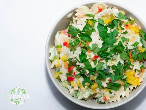 pasta, witte selder, dressing, paprika, maïs, tomaat, komkommer, ui,