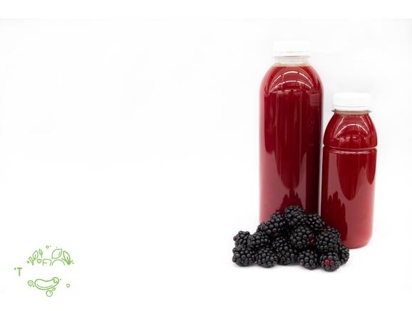 Dagelijks vers geperst sap met appelsien en braambessen.