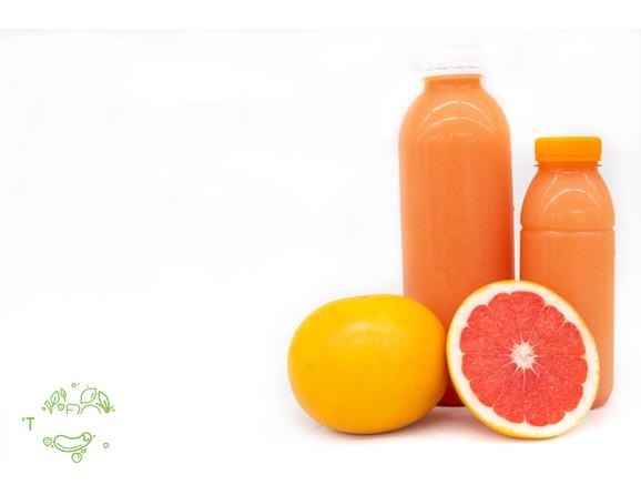 Dagelijks versgeperst sap met appelsien en pompelmoes. 's Ochtends een glaasje pompelmoessap bij het ontbijt is lekker en gezond.