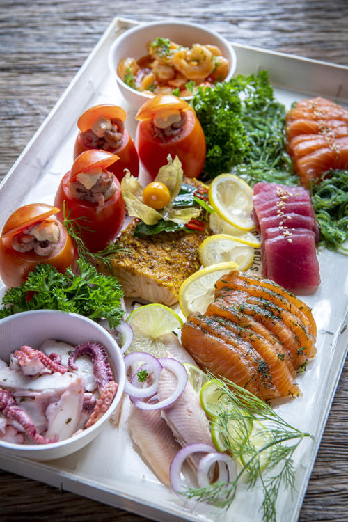 Tomaat garnaal, scampi oriental, oester (enkel tijdens de feestdagen), wakame, nordic zalm, cannelloni van tonijn en king krab, zalm belle vue, inktvis.