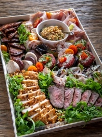 Gerookte kip, tagliata van rundsvlees, traag gegaard buikspek, ambachtelijke beuling, carpaccio d’anvers, vitello tonnato, porchetta, rillette, mortadella.