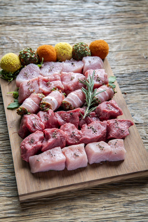 Kipfilet, varkensfilet, runderfilet, kalfsfilet, spekrolletjes, 3 soorten fondue balletjes.