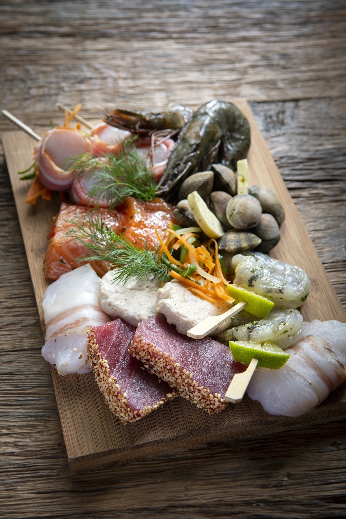 Scampi,coquilles met peper concassé, zalm, tonijn in sesam, gamba, venusschelpjes in papillot, zeeduivel, fish cake.